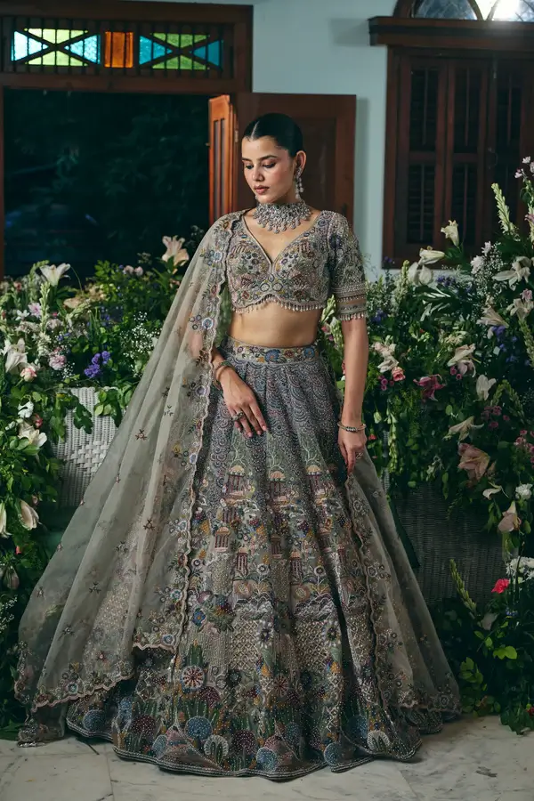 Elevate your ethnic wardrobe with this stunning grey net lehenga, meticulously crafted with comprehensive heavy embroidery work. The intricate detailing showcases traditional craftsmanship, featuring elaborate embellishments across the entire garment that create a luxurious, statement-making silhouette. The lightweight net fabric drapes gracefully while supporting the ornate beadwork and threadwork, making it ideal for weddings, celebrations, and special occasions. Perfect for those seeking a sophisticated blend of classic elegance and contemporary design, this lehenga promises to turn heads with its refined aesthetic and premium construction.