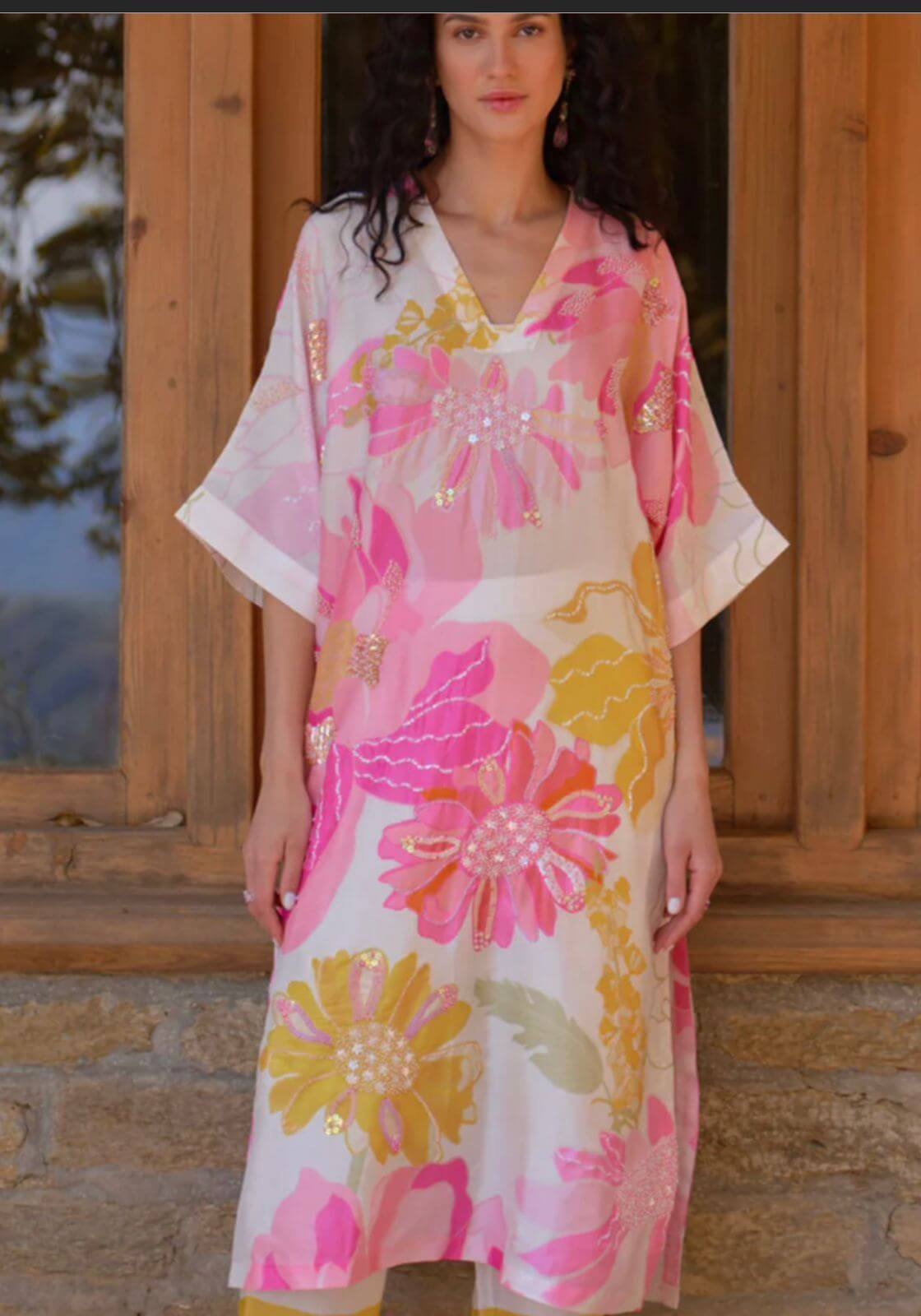 Be the first to review “Pink Silk Sequins V-neck Wild Rose Floral Print Tunic And Pant Set”