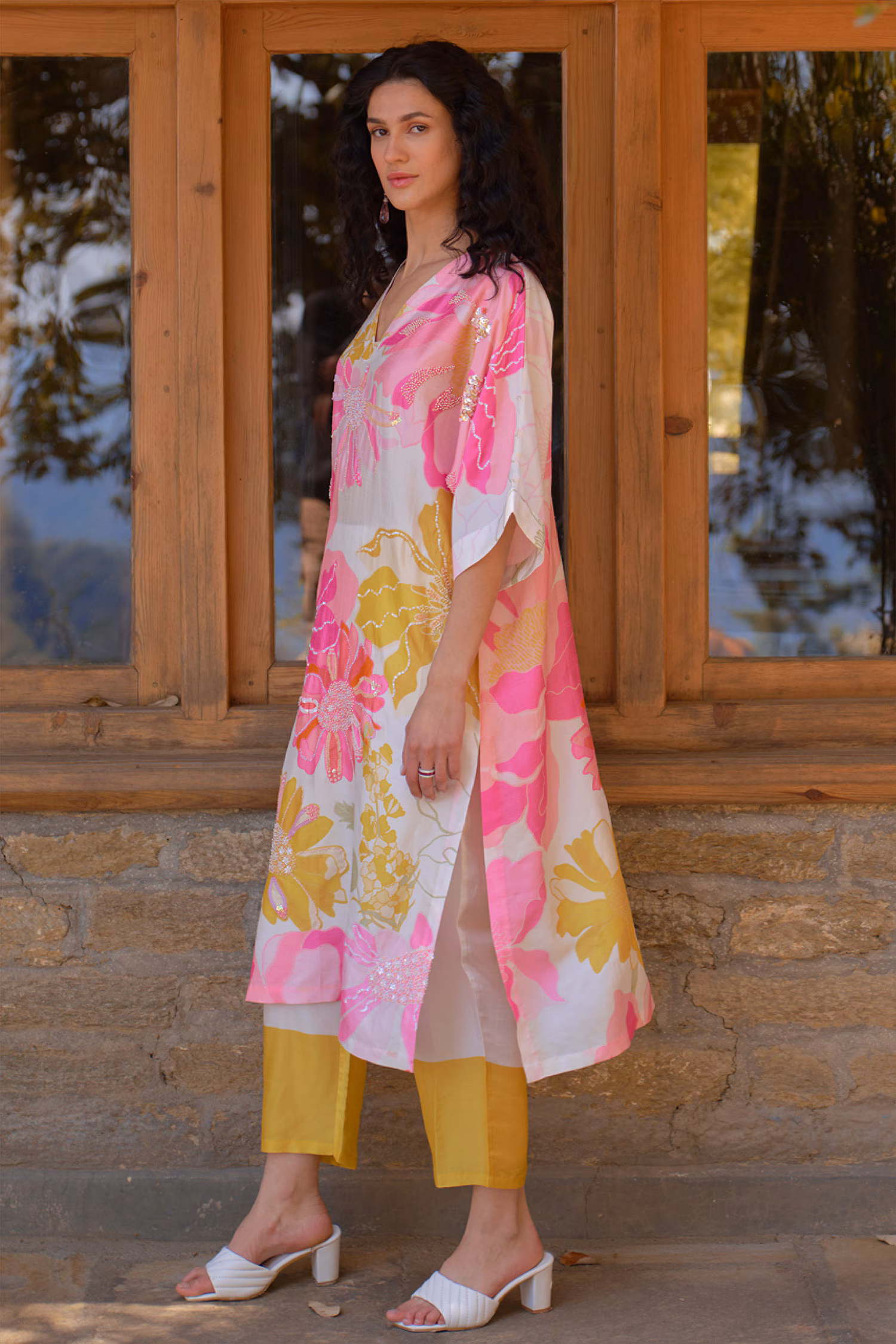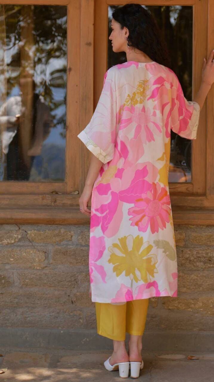 White and pink silk tunic with hand sequin embroidery wild rose floral print and color blocked pants.